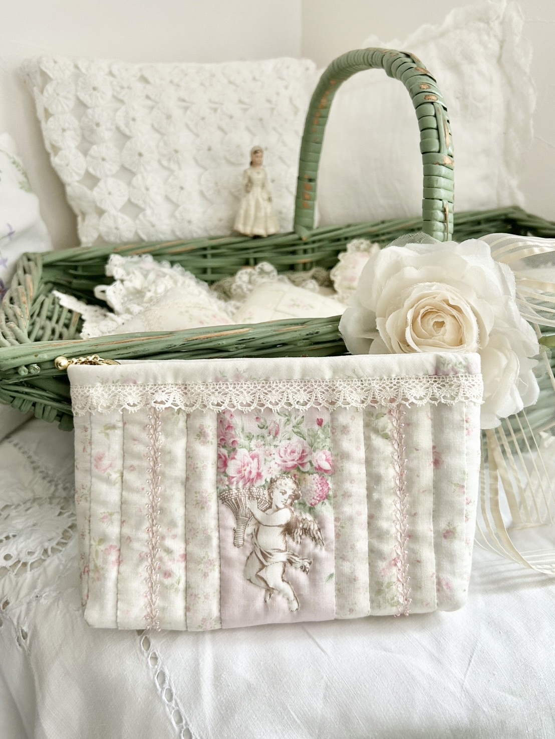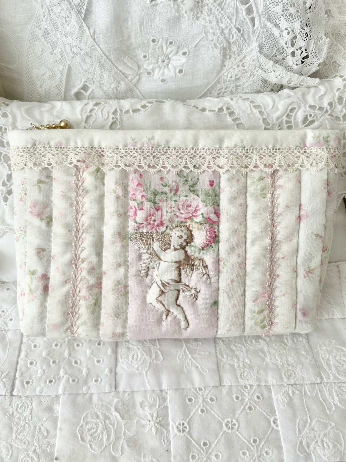 天使柄の生地を使い、フェザーステッチにビーズ、レースを付けてかわいく仕上げました♪