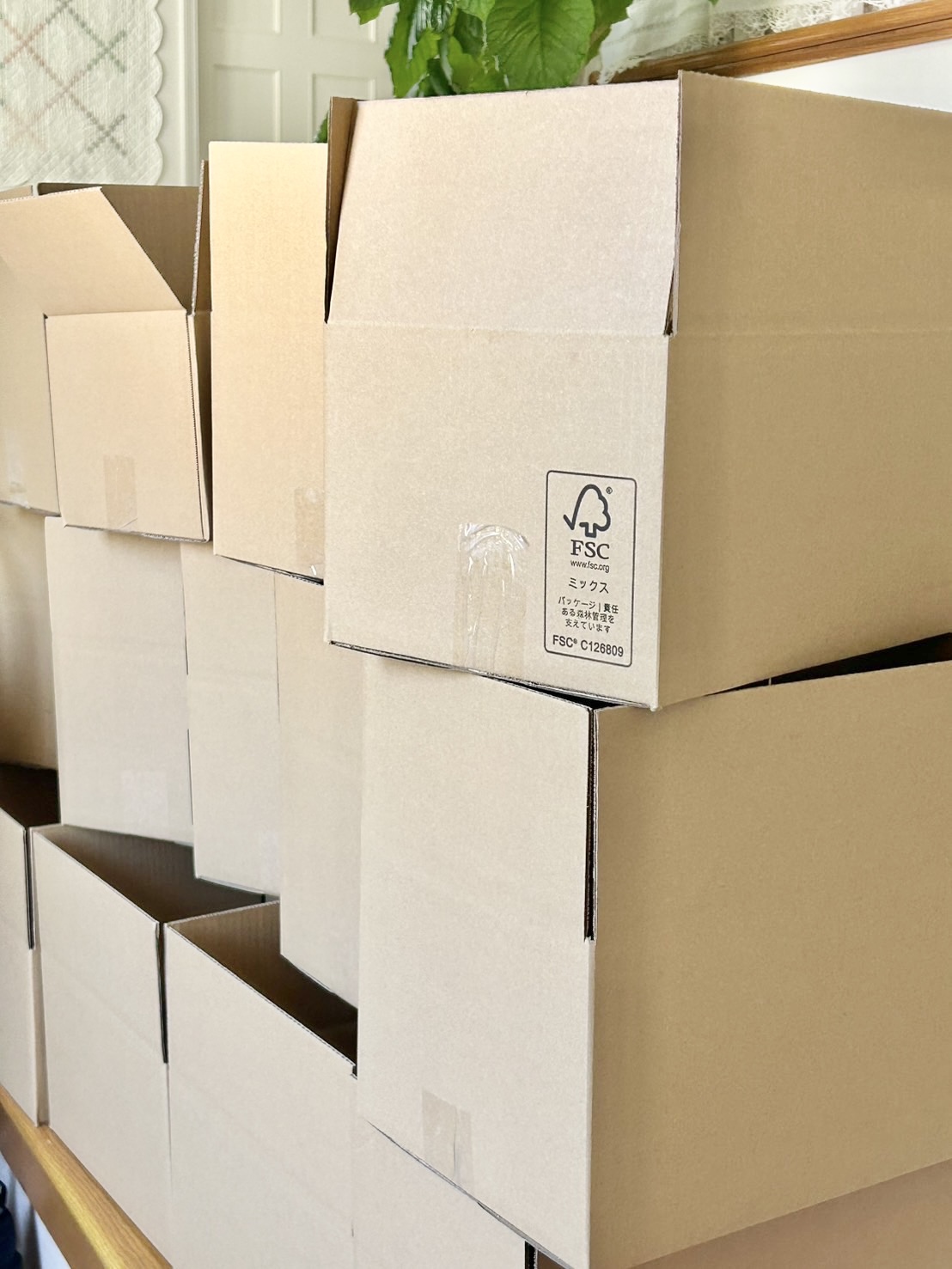 こちらの段ボールに、キット、生地などたくさん入ったセットを作っています。