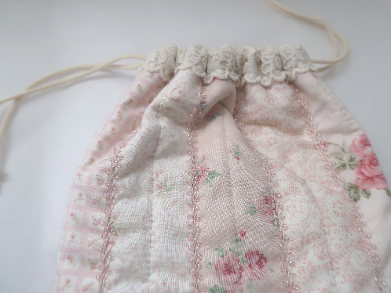 フェザーステッチにビーズが可愛いきんちゃくです。