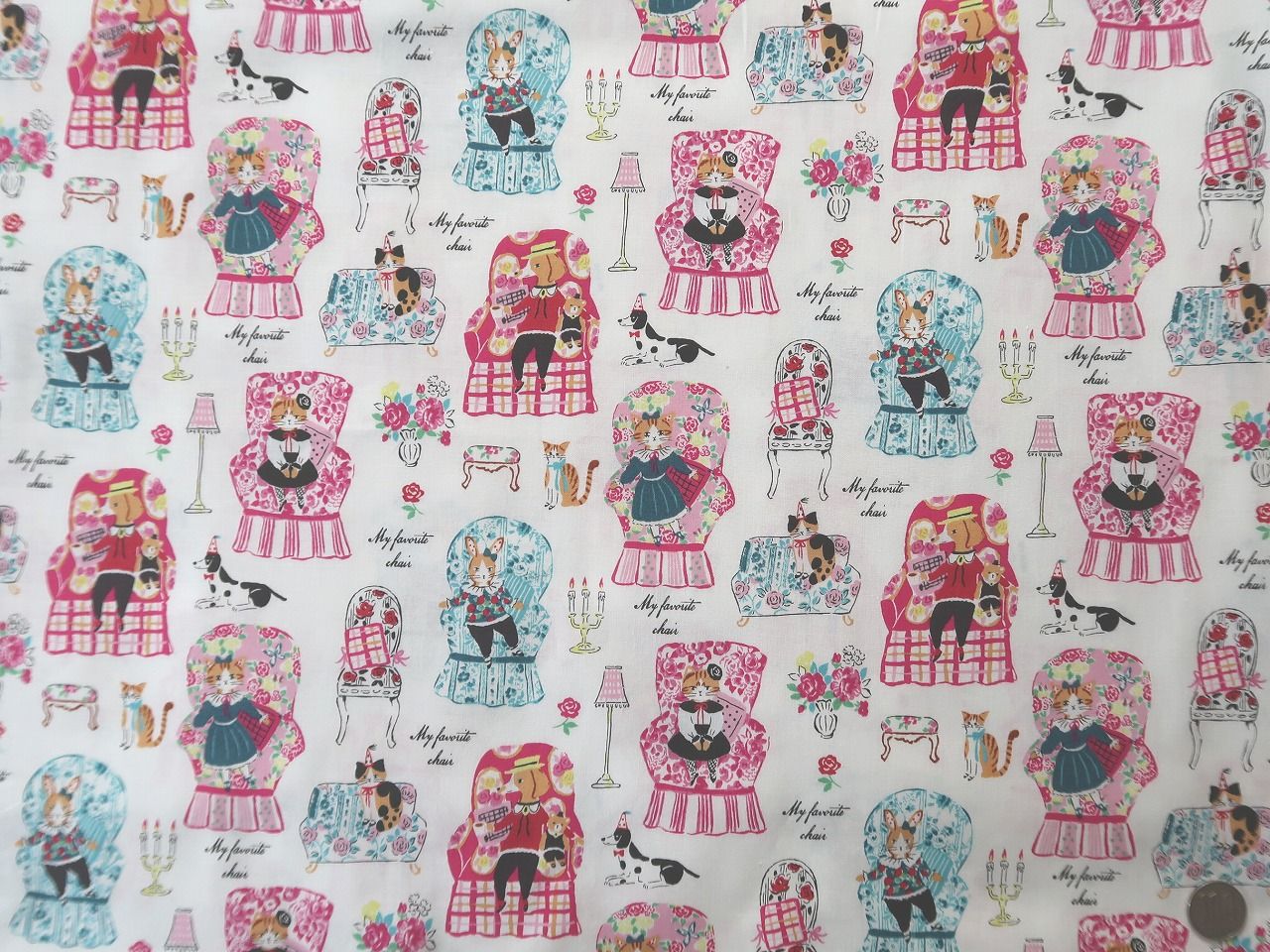 椅子に座ったネコちゃんやワンちゃんが並んでいる生地です。